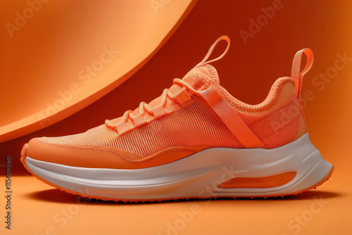 Pair of orange sneakers on orange background, vibrant and eye-catching.