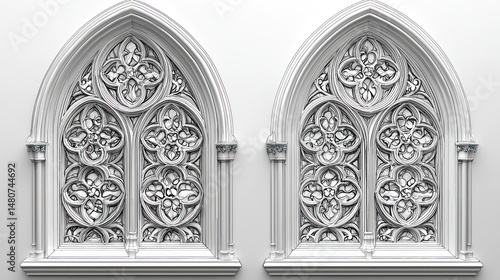 Pair of ornate, arched window frames with intricate, floral tracery, rendered in a minimalist, 3D model style