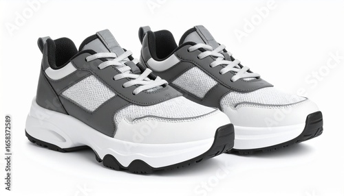 "Pair of trendy chunky platform sneakers in white and gray, isolated on white background, modern streetwear style"