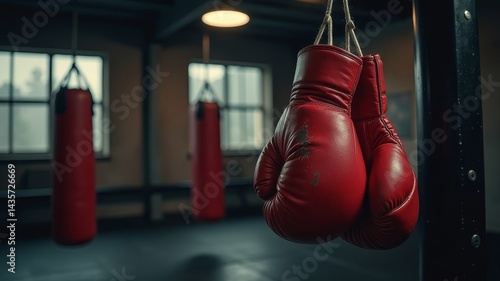 boxing, glove, gym, sport, training, fitness, physical exercise, punching, red, old, worn, leather, professional, athlete, competition, martial, art, fight, strength, endurance, hanging, sharpened, light, shadow, background, atmosphere, motivation, health, energy, preparation, resilience, rugged, gritty, determination, masculine, effort, discipline, toughness, lifestyle, conditioning, stamina, indoor, practice, challenge, persistence, equipment, exercise, performance