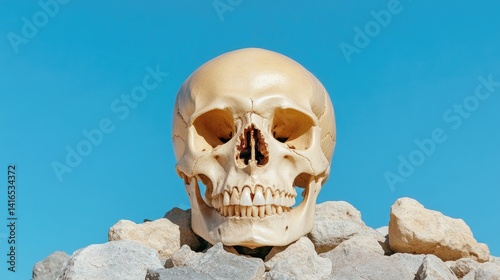 Pale skull atop rocks against vibrant blue sky