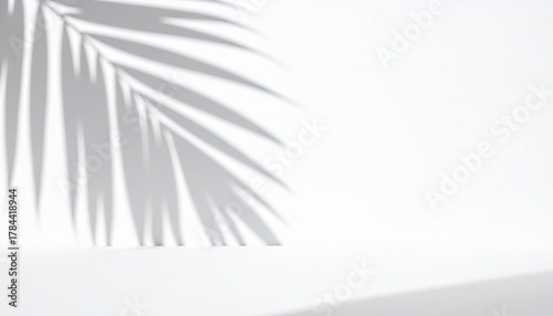 Palm leaf shadow on white background, tropical plant silhouette, minimalist summer aesthetic, natural light effect, empty space for product display