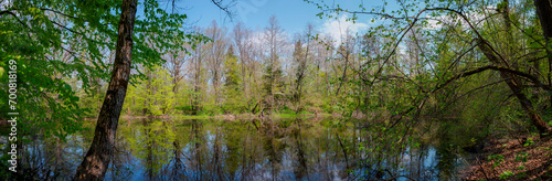 Panorama of forest lakes in spring, young leaves and freshly blossomed buds of trees and shrubs