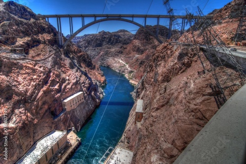 dam, hoover, memorial, bridge, pat, plant, power, river, panorama, panoramic, colorado, cliff, lake, view, top, aerial, up high, black, canyon, rock, water, arizona, united, state, america, us, nevada, las vegas, construction, engineering, landmark, desert, landscape, concrete, reservoir, hydroelectric, technology, electric, energy, arch, electricity, boulder