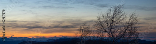 Panorama of the silhouette of mountains and forest on the background of sunset