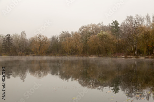Panorama on the Grube Fernie on a cold, foggy and grey morning in Autumn 2024, Großen-Linden, Hessia, Germany