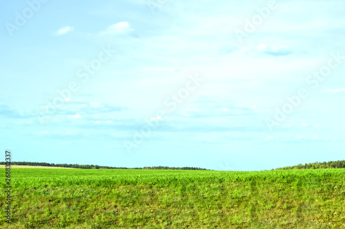 field, blue, sky, green, nature, panorama, rural, grass, spring, background, summer, beautiful, countryside, landscape, meadow, land, panoramic, horizon, season, sunny, open, wood, beauty, cloud, environment, fluffy, peaceful, sun, tree, plant, scenery, warm, cereal, scenic, natural, space, farmland, day, sunlight, sunbeam, crop, wheat, park, farm