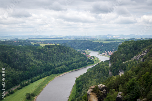 Panorama view from rocks Bastei to river Elbe and Rathen, Saxon Switzerland, Germany