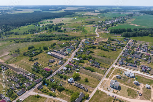 panoramic aerial view of eco village with wooden houses, gravel road, gardens and orchards