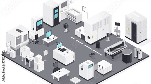 Panoramic illustration of advanced technology laboratory distribution manufacturing factory