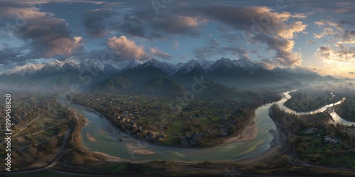 panoramic, vale, river, mountain, snow, sunset, landscape, nature, village, settlement, rural, aerial, winding, waterway, environment, scenic, natural, terrain, majestic, remote, beautiful, cloudy, sky, dramatic, horizon, peaceful, tranquil, serenity, high, angle, view, sprawling