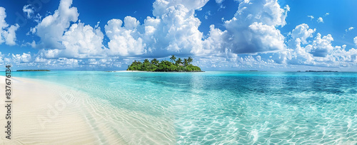 panoramic view of a beautiful tropical beach with white sand and turquoise water in the background of an island, a blue sky with clouds, a banner for travel vacation summer holiday concept in the styl