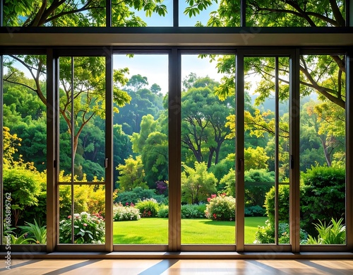 garden, view, window, tree, greenery, flower, grass, sunlight, outdoors, nature, tranquil, peaceful, lush, beautiful, scenic, roomy, home, interior, exterior, glasses, sliding, door, green, landscape, fresh, spring, summer, natural, relaxation, calm, bright, colourful, design, modern