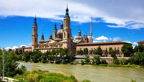 cathedral, spanish, river, city, architecture, sky, cloud, green, tree, beige, building, europa, tour tourism, travel, landmark, stone, facades, sunny, exterior, landscape, historic, river bank, panorama, holiday maker, huge, majestic, grand, water