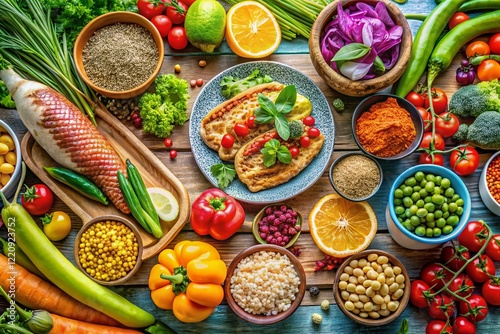 Panoramic View of a Vibrant Mediterranean Flexitarian Meal: Fresh Produce, Herbs, and Lean Protein