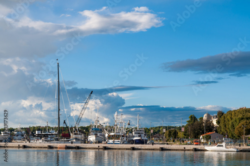Panoramic view of city dockside with fishing vessels moored against blue sky