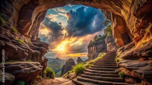 Panoramic View of Majestic Cave Entrance, Dramatic Staircase Descent