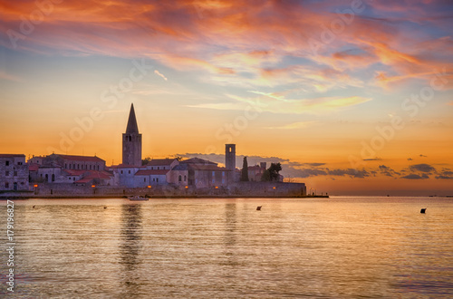 Panoramic view of Porec, during sunset with cloudy sky. Croatia, Adriatic coast