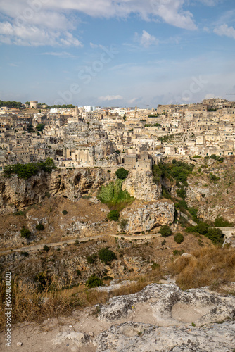 Panoramic view of Sassi di Matera a historic district in the city of Matera, well-known for their ancient cave dwellings from the Belvedere di Murgia Timone, Basilicata, Italy