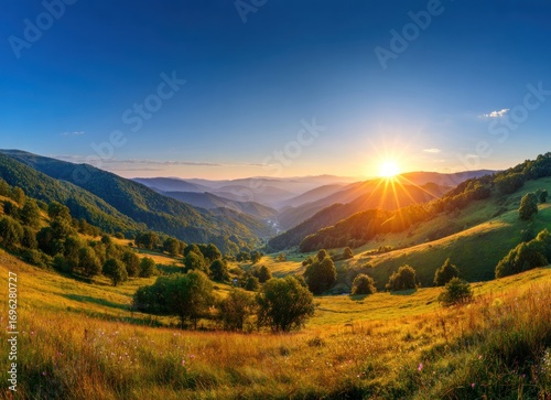 Panoramic view of sun shining over golden hills and lush green valley, under a clear blue sky at sunset, conveying peaceful beauty