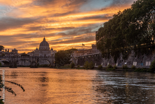 Panoramic View of the Dome of the Basilic of Saint Peter in Rome beside the Bridge on the Tevere River in Rome at Sunset