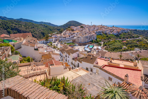 Panoramic view of whitewashed houses, rooftops and Mediterranean Sea, Frigiliana, Malaga Province, Andalucia