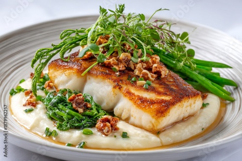 cod, fish, plated, epicure, seafood, healthy, meal, fine dining, eatery, food, cookery, haute cuisine, dinner, lunch, delicious, fresh, cooking, portion, nourishment, protein, main course, side dish, green beans, spinach, nut, hazelnut, presentation, chef, gastronomic, elegant, dish, white plate, light background, studio shot, no people, horizontal, closeup, healthy eating, diet, omega 3, cooked, prepared, professional, gourmet food
