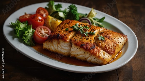 cod, fish, seafood, lemon, herb, parsley, thyme, broccoli, salad, vegetable, tomatoes, cucumber, red onion, lettuce, healthy, dinner, receipe, cooking, food photography, eatery, epicure, delicious, appetising, crispy, flaky, juicy, flavorful, seared, white plate, meal, protein, mediterranean, sauce, gastronomy, cookery