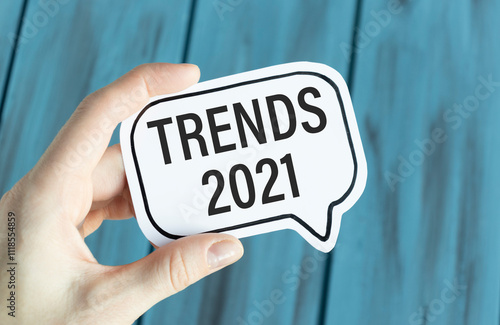 Paper with text TRENDS 2021 in hand on the blue background