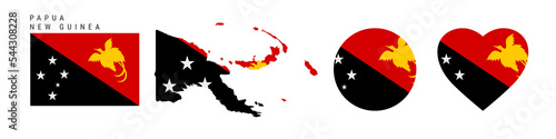 Papua New Guinea flag icon set. PNG pennant in official colors and proportions. Rectangular, map-shaped, circle and heart-shaped. Flat vector illustration isolated on white.