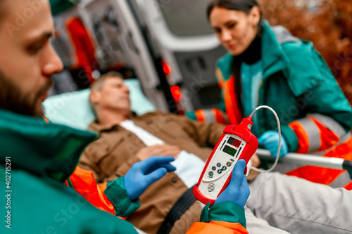 Paramedics check the level of oxygen in the blood and transport the elderly patient's gurney from the modern ambulance for further medical care at the clinic.