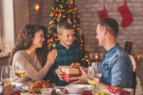christmas, family, dinner, present, surprise, exchange, eating, food, drink, mother, son, father, children, lunch, love, holiday, winter, festive, celebration, december, new year, meal, three, people, person, caucasian, happy, cheerful, smiling, beautiful, christmas tree, christmas lights, decoration, ornament, table, sitting, together, fun, home, domestic, leisure, lifestyle, seasonal, tradition, thanksgiving
