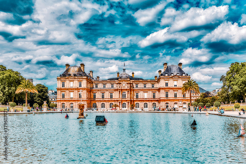 PARIS, FRANCE - JULY 08, 2016 : Children float boats in the fountain Luxembourg Palace and park in Paris, Jardin one of the most beautiful gardens in Paris. France.