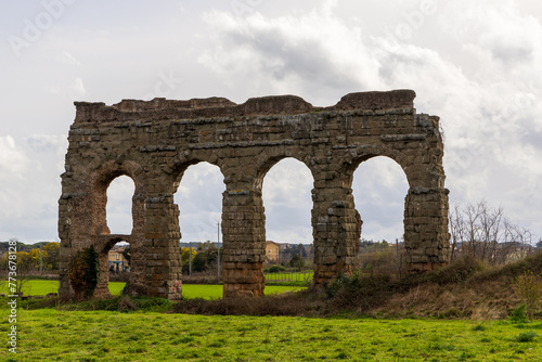 Park of the Aqueducts (Parco degli Acquedotti), an archeological public park in Rome, Italy, part of the Appian Way Regional Park, with monumental ruins of Roman aqueducts.