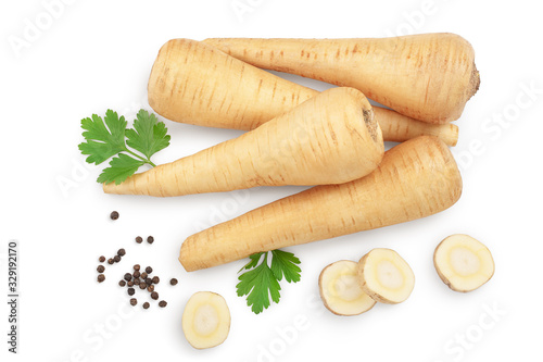 Parsnip root and slices with parsley peppercorns isolated on white background with clipping path. Top view. Flat lay