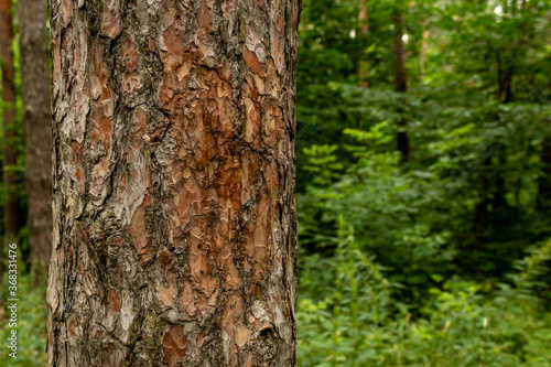 Part of a tree trunk against a forest background. The relief texture of the brown bark of the tree in outgrowths and cracks. The bark of the tree is brown. Detail Shot Of Tree Trunk. Pinewood.