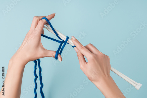 partial view of woman with blue yarn and white knitting needles knitting on blue backdrop