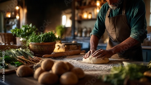 baker, dough, kneading, flour, hand, apron, herb, vegetable, potato, cooking, baking, bread, homemade, rustic, kitchen, warm, cosy, natural, ingredient, fresh, preparation, culinary, skill, traditional, craft, workspace, rolling pin, bowl, green, plant, ambience, earthy, organic, artisan, home cooking, comfort food, wholesome, farmhouse