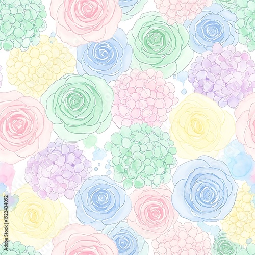 Pastel Colored Roses and Hydrangeas Floral Pattern on White Background