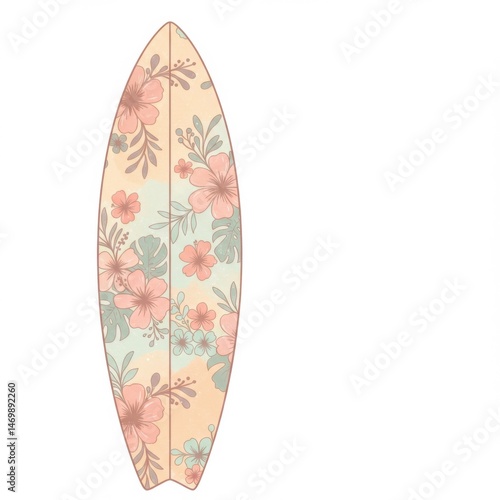 surfboard, floral, summer, beach, tropical, flower, pastel, design, surf, wave, ocean, water, sport, leisure, summer, vacation, holiday, travel, pink, coral, peach, beige, cream, green, leaf, hibiscus, illustration, pattern, artistic, artwork, decorative, vibrant, colourful, graphic, digital, art, image, drawing, element, isolated, background, white
