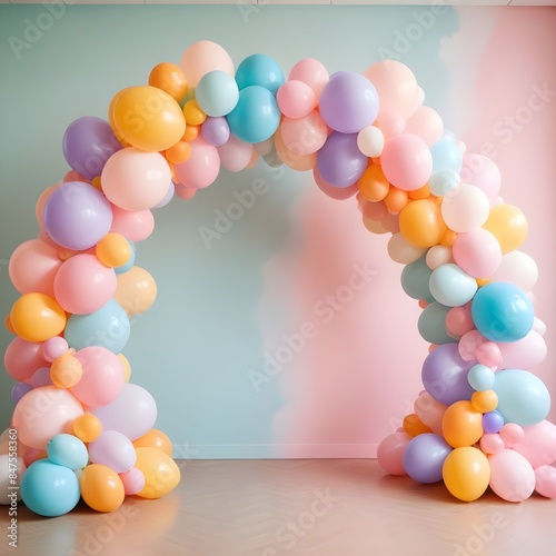 Pastel multicolour balloon arch decoration with pastel backgrounds