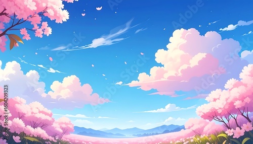spring, blossom, cherry, pink, pastel, cloud, sky, blue, landscape, nature, flower, tree, field, fluffy, peaceful, beautiful, soft, gentle, vibrant, digital, art, illustration, panorama, wide, open, scenic, summer, warm, delicate