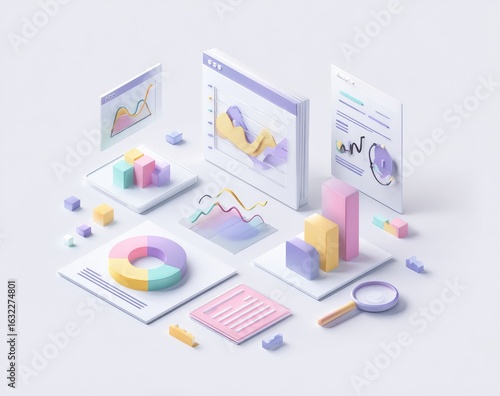 datum, visualisation, chart, graph, report, isometric, three-dimensional, graphic, pastel, colours, modern, minimalist, design, analysis, business, infographic, information, trend, statistic, performance, growth, progress, number, summary, document, browser, window, pie, bar, line, digital, technology, presentation, cube, layout, interactive, success