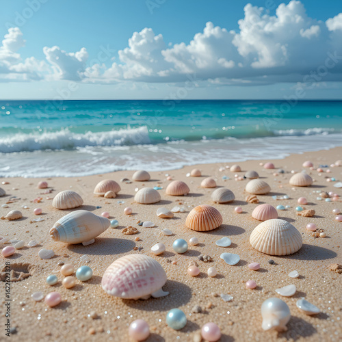 Pastel-Colored Shells and Pearls on Fine Beach Sand