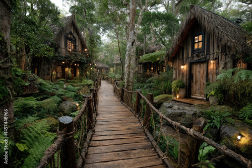 Path through eco homes in deep jungle setting