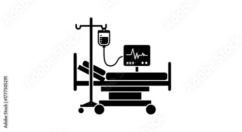 patient, bed, hospital, medicals, treatment, health care, illustration, monitor, equipment, 4, drip, racked, black, white, isolated, graphic, care, health, clinic, medicine, emergency, recovery, wellness, support, therapy, pulse, life, science, research, analysis, diagnosis, symptom, body, anatomy, disease, doctor, nurse, professional, assistance, aid, sterile, clean, simple, minimalist, vector, digital, design, concept, symbol