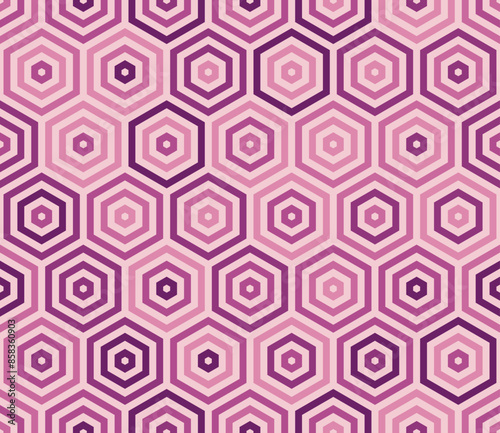 Pattern of hexagon shapes. Stacked hexagon bold mosaic cell. Purple color tones. Large hexagon shapes. Tileable pattern. Seamless vector illustration.