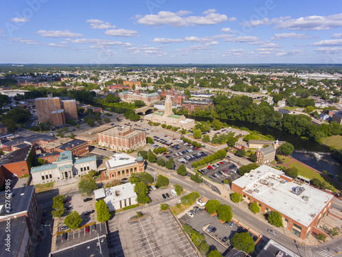 Pawtucket city hall on Roosevelt Avenue, William E Tolman High School and Blackstone River aerial view in downtown Pawtucket, Rhode Island RI, USA.