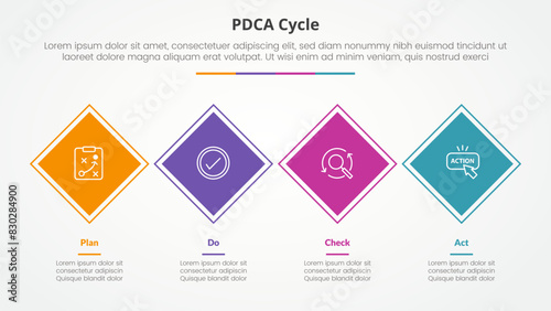 PDCA plan do check act framework infographic concept for slide presentation with rotated square or diamond shape horizontal direction with 4 point list with flat style