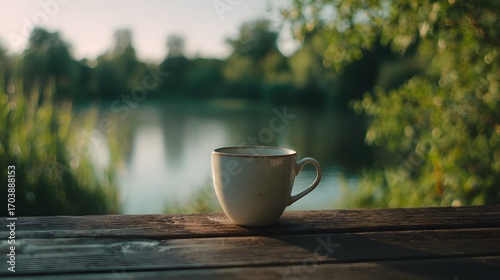 Peaceful morning coffee mug on wooden table with lake and nature background, relaxing outdoors sunrise drink scene with calm lifestyle atmosphere